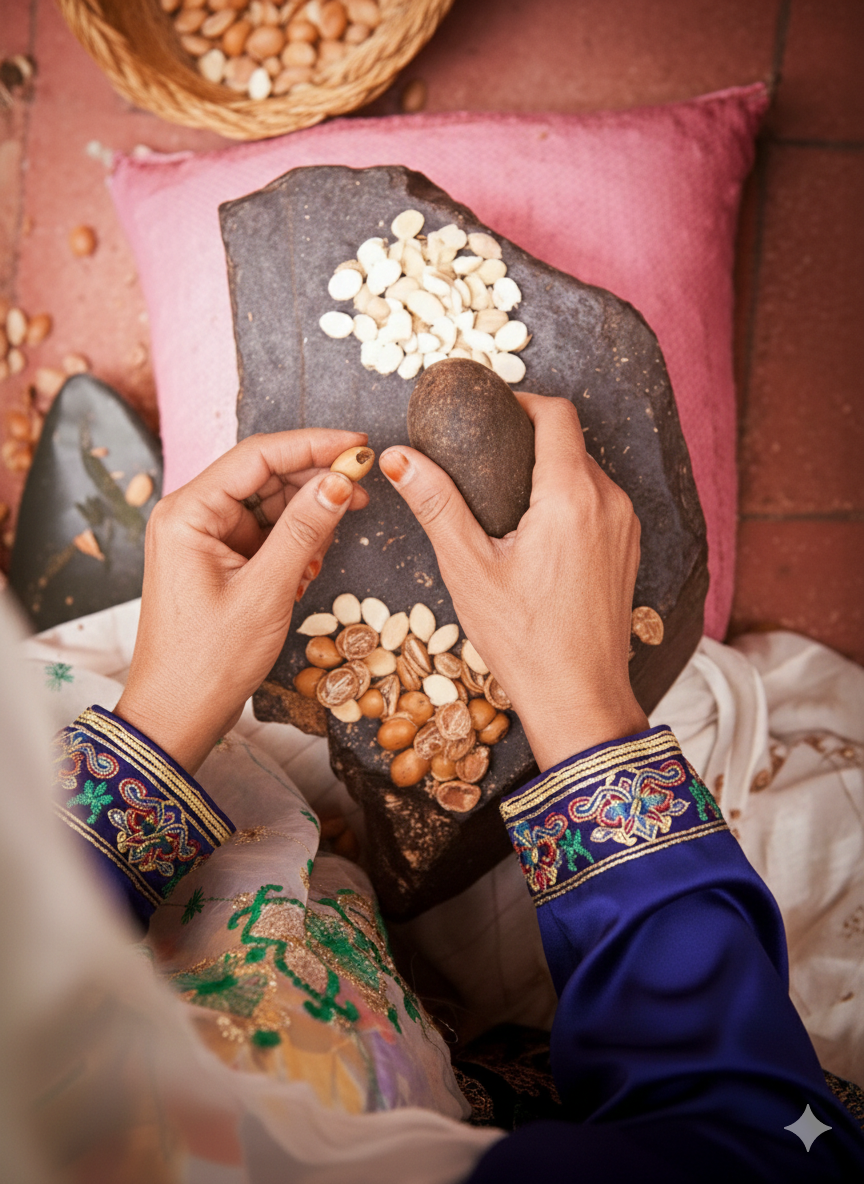 Rooted in ancestral ritual, our collection honors the timeless rhythm of the women who safeguard Morocco’s "liquid gold." At the heart of our story is the Azergue—the traditional stone mill turned by hand to reveal argan in its purest, most nourishing form.